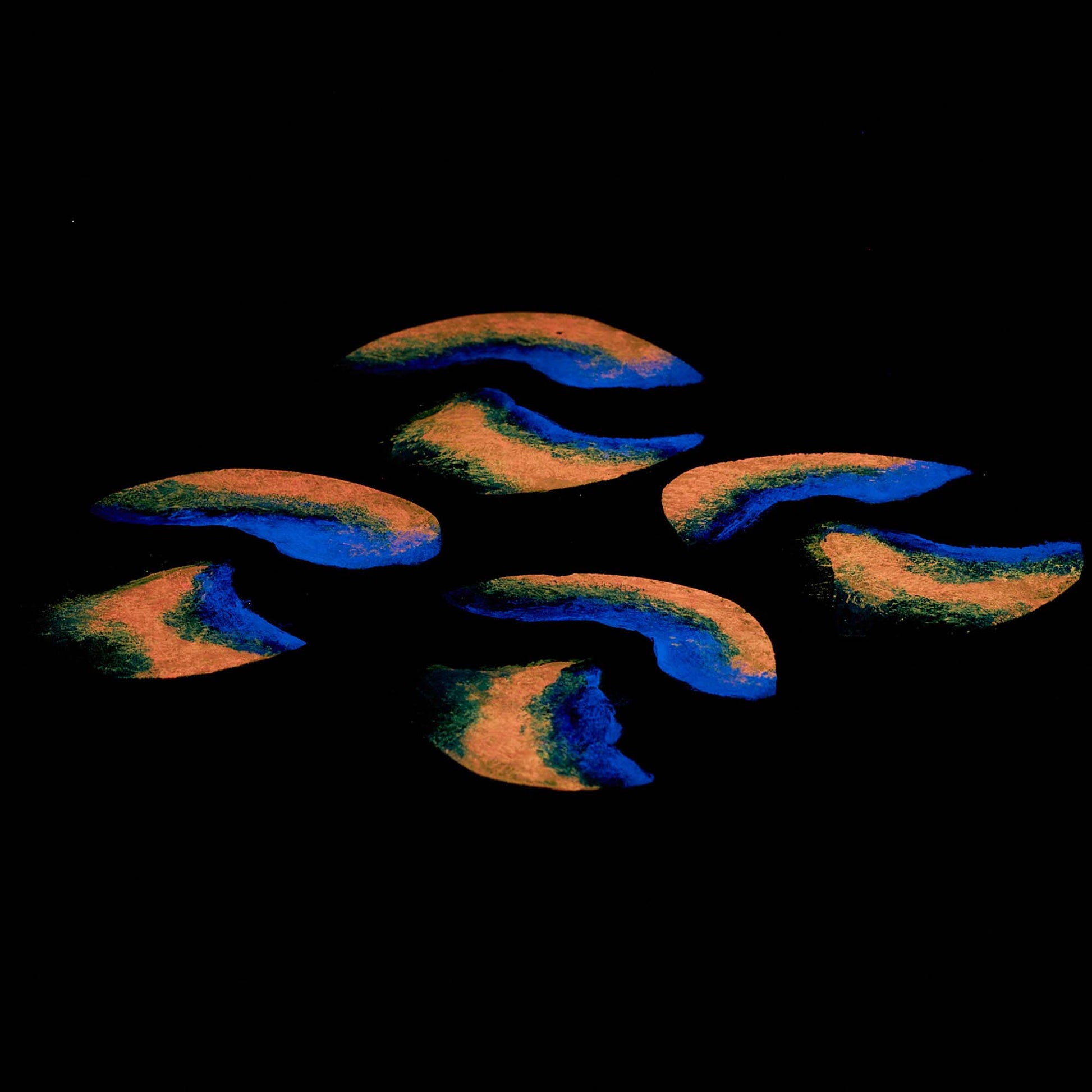 Originalus bei modernus rankų darbo meno kūrinys, tapytas akriliniais bei fosforiniais dažais, kurie tamsoje švelniai švyti. Šie dažai sugeria šviesos energiją ir vėliau ją išskiria - tai vadinama fotoliuminescencija, natūraliai pasireiškianti kai kuriuose gamtoje esančiuose mineraluose. Šviesą kaupianti technologija leidžia dažams pasikrauti nuo bet kokio šaltinio - saulės, LED, UV, o švytėjimas gali trukti iki 4-6 valandų.